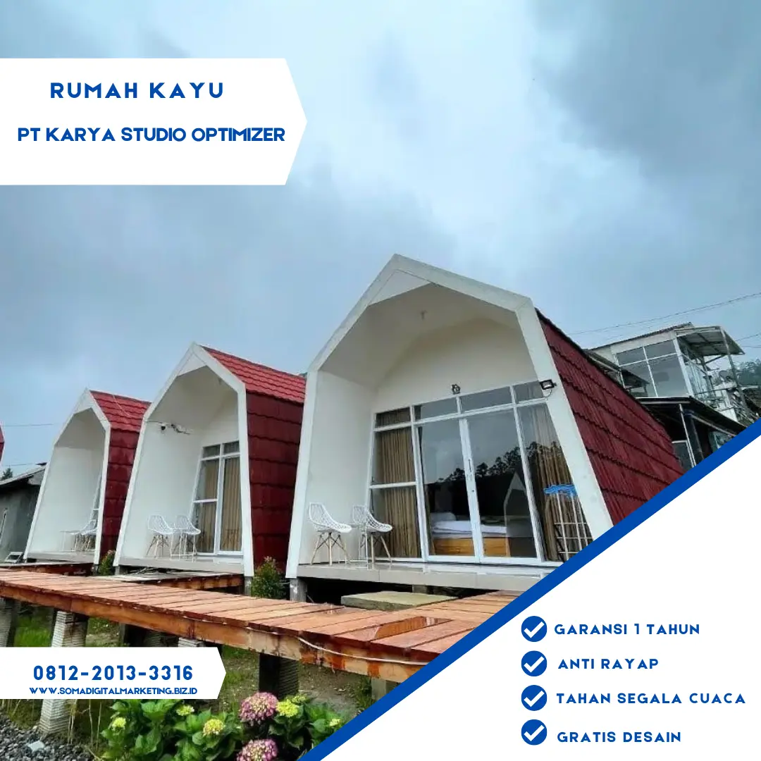 Paket rumah kayu harga mulai dari Rp 3.000.000/m², menggunakan kayu dengan standar lebih tinggi dari kompetitor.